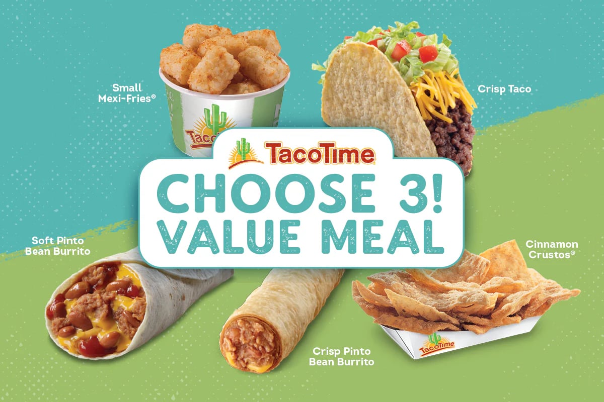 Select three of your favorites between a Small Mexi Fries, Crisp Beef Taco, Soft Bean Burrito, Crisp Pinto Bean Burrito, and Cinammon Crustos® for just $8!